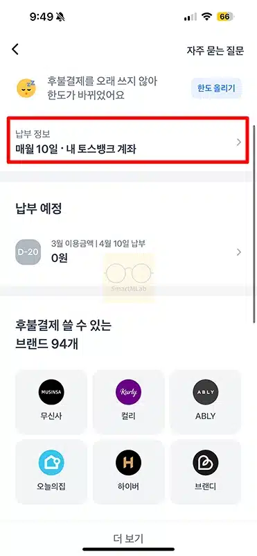 3. 후불결제 화면에서 현재 결제일과 납부 정보를 확인할 수가 있습니다. 여기를 클릭합니다.