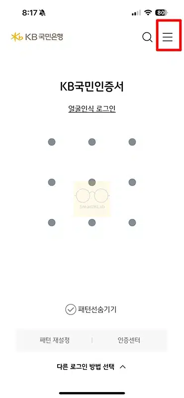 1. 스마트폰에서 KB스타뱅킹 앱을 실행합니다. 로그인 화면에서 오른쪽 상단의 ≡를 클립니다. 비로그인 로그인 모두 동일합니다.