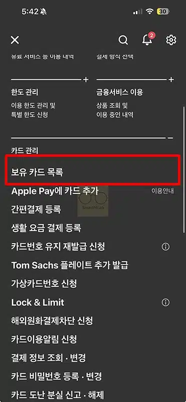 4. 전체 메뉴에서 카드 관리 > 보유 카드 목록을 택합니다.