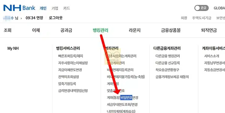 2. 개인뱅킹에서 상단에 뱅킹관리 > 계좌(통장) 비밀번호 변경 메뉴를 택합니다.