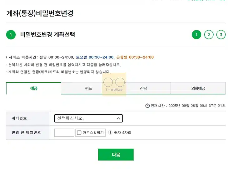직접 방문이 어렵다면 NH스마트뱅킹 앱을 통해서도 비밀번호 오류 해제 및 재설정이 가능합니다.