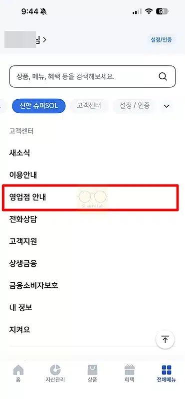 2. 신한은행 SOL 뱅크 앱 메인에서 전체메뉴를 선택 후 고객센터 아래에 영업점 안내 메뉴를 클릭하세요.