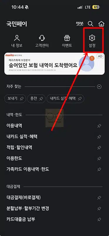 1. KB Pay 앱을 실행합니다. 그리고 ☰를 클릭하여 전체 메뉴로 이동합니다. 여기에서 설정을 클릭하세요.