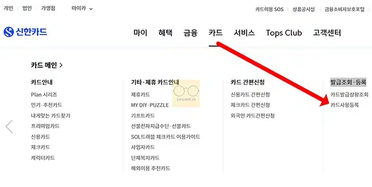 2. 로그인 후 카드 > 발급조회·등록 > 카드사용등록 메뉴를 클릭하세요.