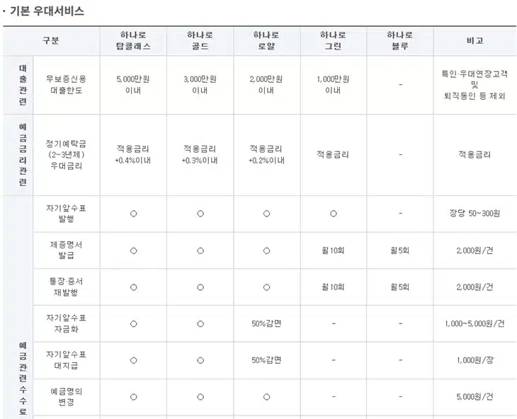 예금 관련 수수료에서도 등급 차이가 분명합니다. 자기앞수표 발행, 제증명서 발급, 통장·증서 재발행, 자기앞수표 자금화, 대지급, 예금명의 변경, 사고신고, 대여금고, 보호예수, 보관어음 수탁 등에서 탑클래스와 골드가 가장 넓은 우대를 받습니다. 로얄은 일부 감면 그린은 횟수 제한 우대 블루는 최소 수준의 혜택만 제공되는 구조입니다.